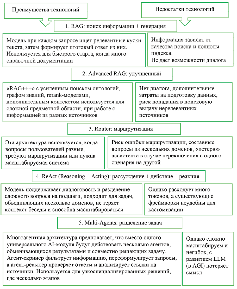 Для корпоративных ИИ-ассистентов необходимо правильно выбрать архитектурный шаблон для планируемой задачи. Оптимальной архитектурой можно назвать ту, которая эффективно решает бизнес-задачи сегодня и готова масштабироваться для задач завтра в рамках принятия стратегических управленческих решений.