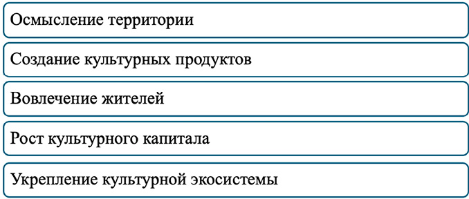 3. Данные инструменты усиливают вовлеченность жителей и формируют условия для развития этнической идентичности и культурного капитала, поскольку позволяют людям не только потреблять культурные продукты, но и участвовать в их создании. Включенность жителей в культурные процессы способствует укреплению доверия и развитию социального капитала, который становится важной основой развития территорий.